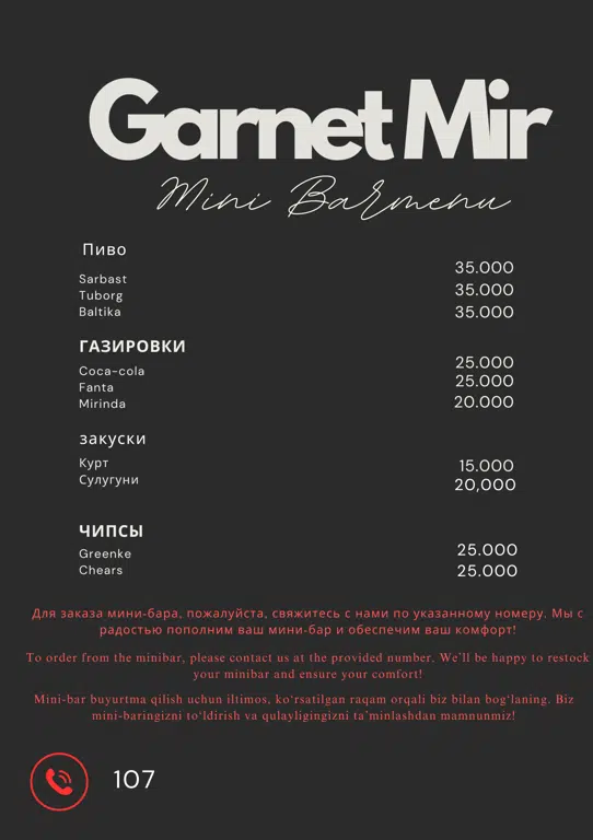 Позвоните нам, чтобы пополнить ваш мини-бар и насладиться комфортом на максимум!